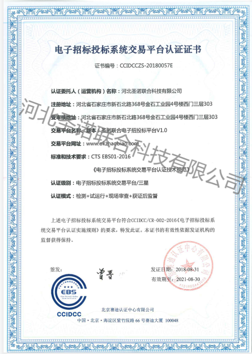 《圣諾聯(lián)合電子招投標(biāo)平臺》順利通過中國軟件評測中心檢測獲得EBS三星級認(rèn)證證書,達(dá)到國家最高級別檢測認(rèn)證。《圣諾聯(lián)合電子招投標(biāo)平臺》是河北圣諾聯(lián)合科技有限公司自主研發(fā)、具有完整知識產(chǎn)權(quán)的電子招投標(biāo)平臺,在全國少數(shù)的三星級平臺中脫穎而出,奠定了其在電子招投標(biāo)行業(yè)的領(lǐng)先地位;標(biāo)志著圣諾