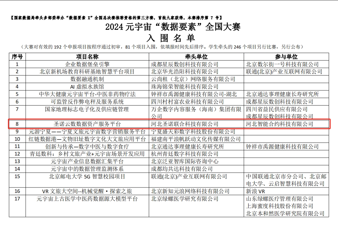 恭喜圣諾聯(lián)合入圍2024元宇宙“數(shù)據(jù)要素”全國(guó)大賽。我公司在報(bào)名2024元宇宙“數(shù)據(jù)要素”全國(guó)大賽中,已經(jīng)成功入圍,擁有大賽參賽資格,接下來(lái)已經(jīng)在參加比賽中充分準(zhǔn)備。
